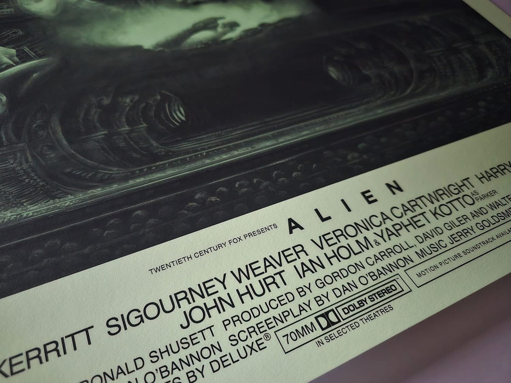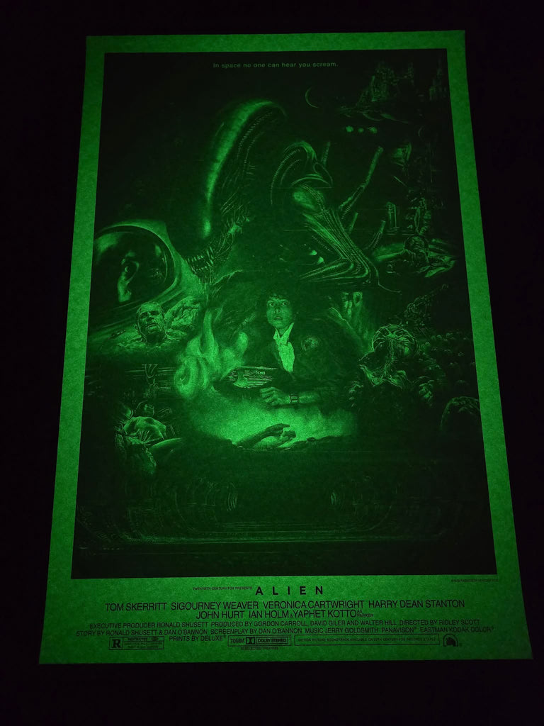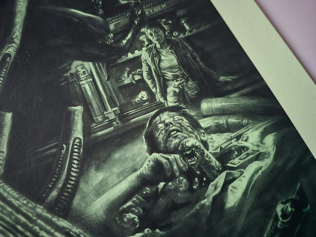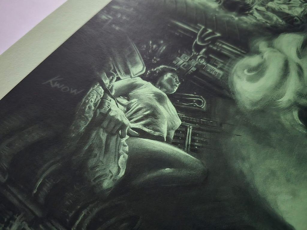 Acid variant, this one was kind of a homage to a few things such as that green glow from the original one sheet as well as Ken Taylor's Alien poster in terms of colour. It was a bit of a dark gloomy day in the UK when I took the photos, it looks a bit different in person but if you are looking through a backlit vivid mobile phone screen it's probably not far off, it's a really nice looking black and green monochrome that really suits Kwow's art. It's also a nod to the colours of the retro computer screens in the movie.
