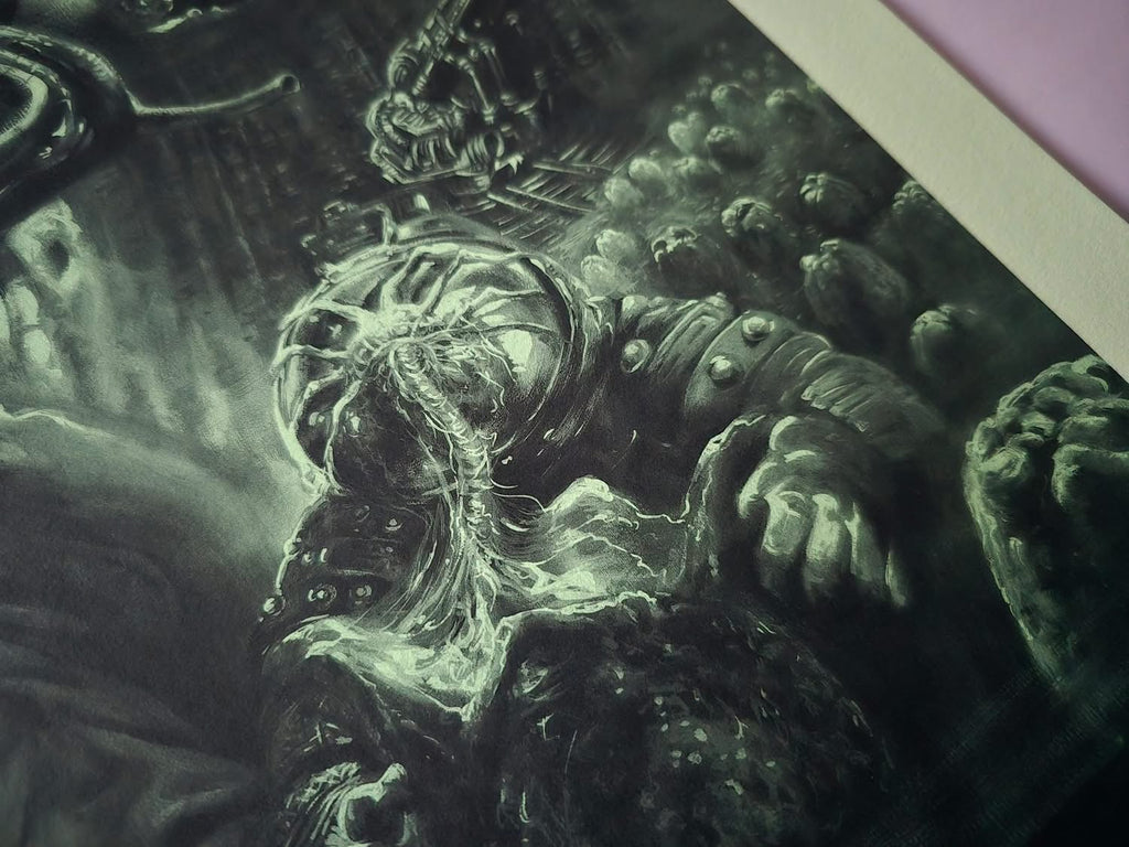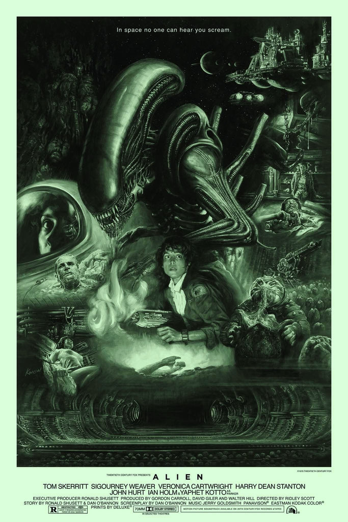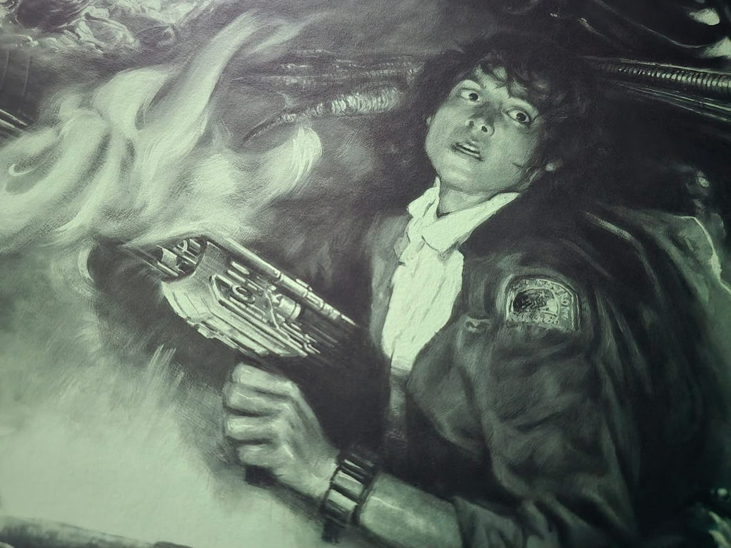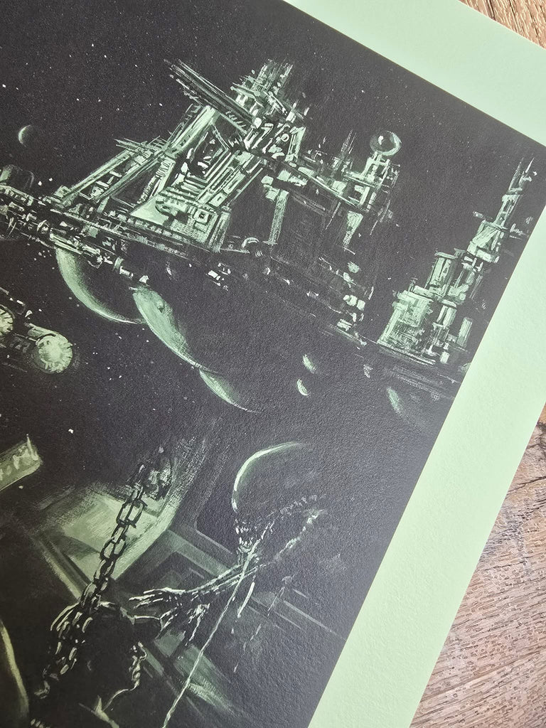 Acid variant, this one was kind of a homage to a few things such as that green glow from the original one sheet as well as Ken Taylor's Alien poster in terms of colour. It was a bit of a dark gloomy day in the UK when I took the photos, it looks a bit different in person but if you are looking through a backlit vivid mobile phone screen it's probably not far off, it's a really nice looking black and green monochrome that really suits Kwow's art. It's also a nod to the colours of the retro computer screens in the movie.