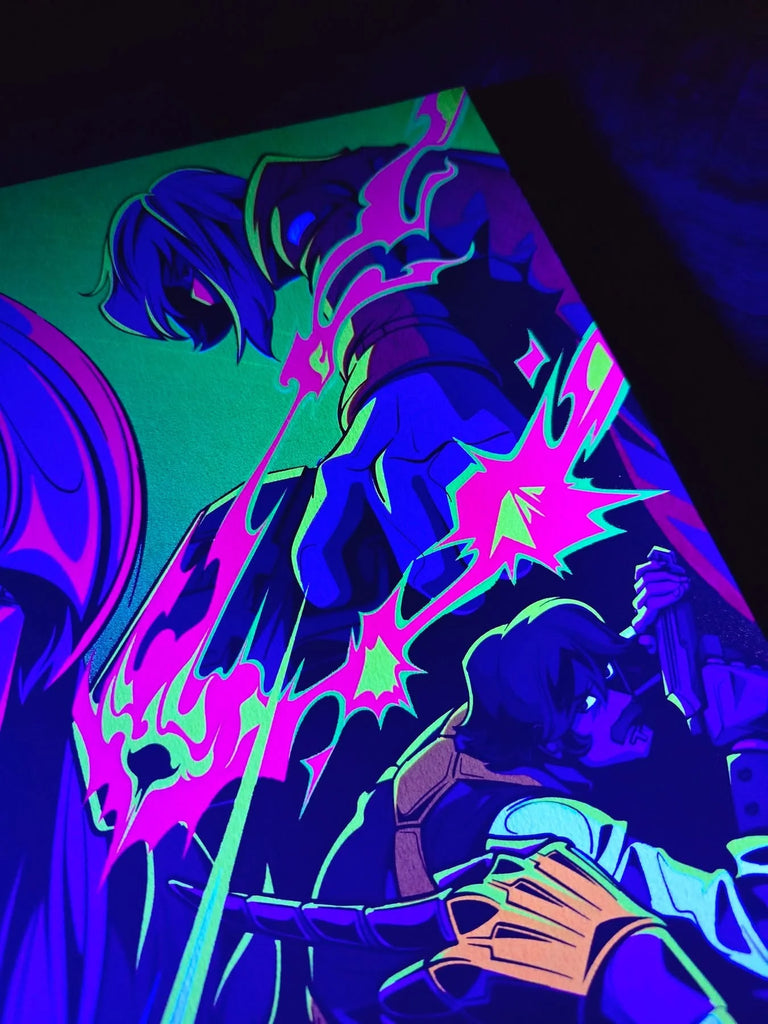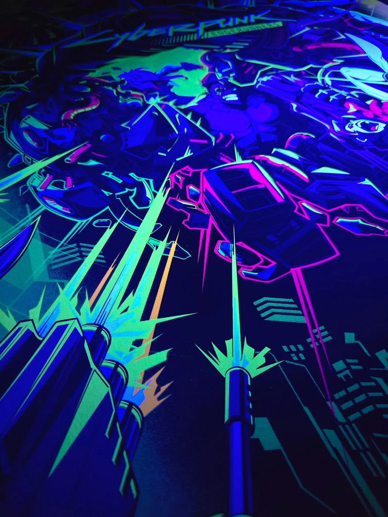 21 x inks in total, lots of fluorescent pigment powder used mixed into the inks, under black light it's like the neon lights of Night City.
